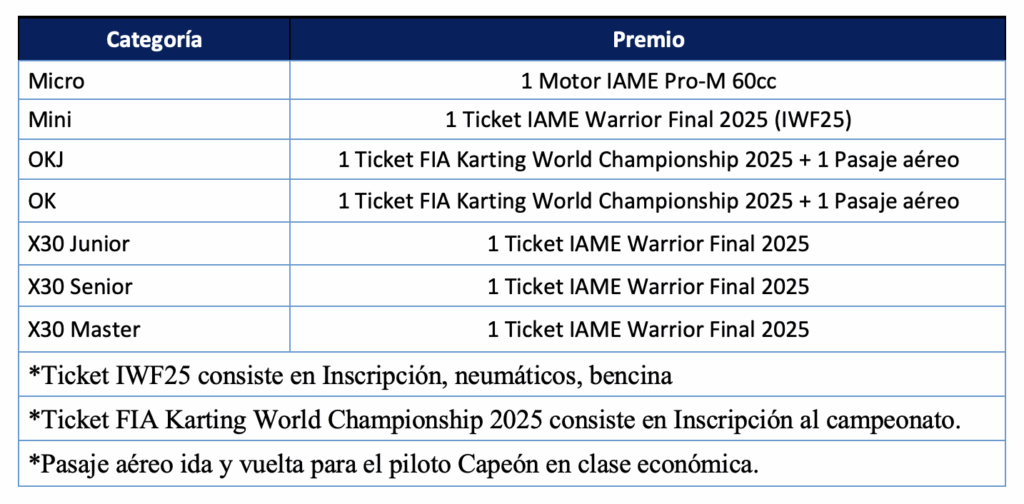 Además del título de ‘Campeón Sudamericano de Karting FIA’ para las categorías OKJ y OK, o ‘Campeón Sudamericano IAME’ para las categorías IAME, los ganadores recibirán el siguiente premio por categoría